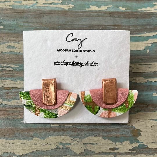 These earrings are a collaboration between myself and Sarah Kay of Penelope Design Studio. To create each earring I first hand painted a large piece of leather in my signature pattern and style. Then, Sarah took the leather and used it to craft the earrings in her signature jewelry styles. Each piece is unique, and one of a kind.