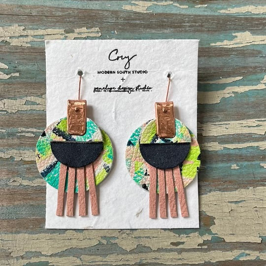 These earrings are a collaboration between myself and Sarah Kay of Penelope Design Studio. To create each earring I first hand painted a large piece of leather in my signature pattern and style. Then, Sarah took the leather and used it to craft the earrings in her signature jewelry styles. Each piece is unique, and one of a kind.