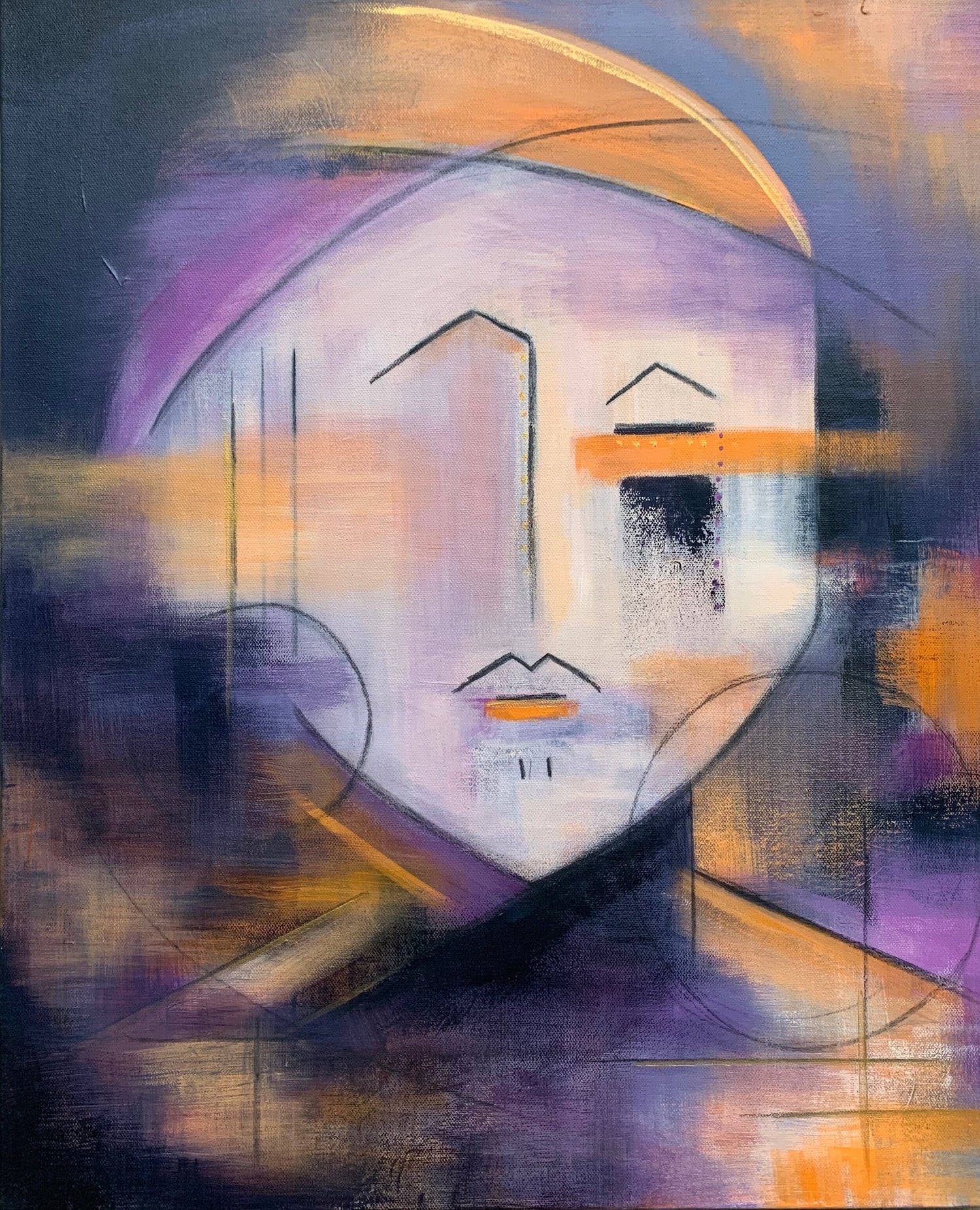This is a canvas piece and is part of my Abstract Faces. She is unique and includes rich tones of purple and orange with gold accents. The canvas is 2 inches thick with painted sides and is ready to hang.